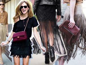 Бахрома имеет свойство придавать образу театральность: чтобы не стать похожей на ковбоя, сочетайте жилеты и кожаные куртки не с джинсами, а с легкими платьями. Уверенные в своих силах модницы могут попробовать обыграть декоративную бахрому на контрасте с цветочным принтом или, например, классическим костюмом, выдержанном в нейтральной цветовой гамме. Если эксперименты вам не по душе, сделайте выбор в пользу классического сочетания монохромного платья простого кроя с ботильонами на плоской подошве или тяжелыми сапогами и сумкой, украшенной замшевой «лапшой». Платья и юбки с длинной бахромой отлично смотрятся с кожаными куртками, а шерстяное пальто можно смело сочетать с классическими лодочками. Что касается вечернего образа, то здесь мы рекомендуем полностью отказаться от этнического мотива в пользу платьев с шелковой бахромой на подоле или стилизованных аксессуаров — благо в весенних коллекциях есть из чего выбрать.