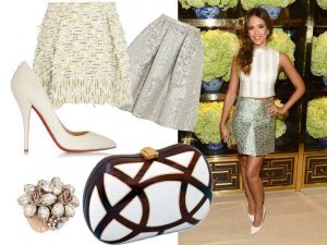 Клатч Rocio, туфли Christian Louboutin, юбка Peter Pilotto, ожерелье St.Erasmus