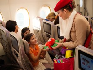 Те, кто путешествует с детьми, знают, что в дорогу приходится брать с собой немало развлекательных и «отвлекательных» предметов, чтобы младшее поколение не скучало в полете… и дало отдохнуть старшим. На этот случай у «Эмирейтс» есть специальные детские рюкзачки с весьма привлекательным содержимым, и коллекция игрушек «Эмирейт» — «Эйрбоу» (AirBoe) и «Огги» (Oggie). Все предметы из коллекции для маленьких клиентов авиакомпании предоставляются бесплатно.