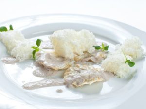 — Блюда с трюфелями. Это холодные закуски, горячее и десерт. В качестве холодной закуски — террин из гусиных печенок с трюфелем и желе из мадеры, тартар со вкусом салями и ароматом белого трюфеля, перепелка с зернами граната, черным трюфелем и жареным яйцом или яйцо цесарки, приготовленное при низкой температуре, с черным кускусом. В качестве горячего предлагается корень козлобородника с пеной из фуа-гра и черным трюфелем, кокот с трюфелем, фиолетовой спаржей, крабом и мартини, или равиоли из корня сельдерея с трюфелем и грибной пеной, ризотто аль тартуфо и конечно, кролик. В десерте — пористый шоколад с ароматом трюфеля, свежей малиной и медовым мороженым или макароны с трюфелем и кремом из фуа-гра