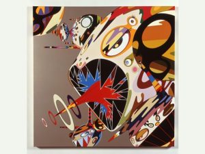 Здесь зритель оказывается в окружении зубастых голов, огромных грибов-мутантов, каких-то инопланетных существ. Черепа, которые встречаются на картинах в самых разнообразных сочетаниях, нередко заполняя все пространство, с первого взгляда не кажутся страшными или отталкивающими — собственно, в калейдоскопе ярких красок, напоминающих тканевый принт, глаз не сразу различает символы смерти. Тем сильнее впечатление от контраста формы и содержания. Мураками позаимствовал этот образ из анимационного сериала 1970-х годов «Тайм Бокан», где череп служил финальной заставкой каждой серии, обещая продолжение приключений любимых героев. Таким образом, Мураками, оставаясь верным все тому же коллажному принципу, заимствует уже не из классического искусства, а из массовой культуры. Парадокс в том, что в традиционной культуре копировались «высокие» образцы, а он делает объектом искусства «низкое».