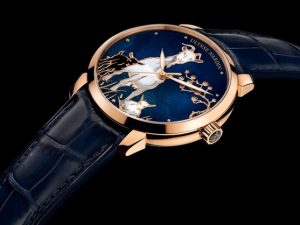 Тонкий рисунок на синем фоне — грациозное животное в окружении двух детенышей (белого и черного цвета — вероятно, дань гармонии инь и ян, и разнообразию этого мира), золотая ветвь дерева и угадывающиеся на заднем плане холмы. Техника выемчатой эмали champelevé далека от «легко и просто», но, согласитесь, результат стоит затраченных усилий. Сначала на поверхности циферблата специальным инструментом вырезаются углубления, которые впоследствии заполнит эмаль нужных оттенков. После заготовку помещают в печь для обжига, в процессе чего эмаль плавится до нужной плотности. Финальный штрих — полировка, придающая изображению более реалистичный вид.