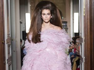 Брюки и шорты, жакеты и блузки, верхняя одежда задают базу, а платья — как благородных приталенных силуэтов, так и пышные, с широкими подолами, завышенной линией талии и рукавами-«фонариками», — формируют собственно кутюрный блок, акцентированный ультраобъемными прическами с начесом и цветочными шлемами, созданными руками кудесника Гвидо Палау.