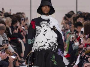 Причем поэзии в буквальном смысле слова: стихи на показе были всюду — на заднике подиума, украшенном инсталляцией с цитатой шотландского художника и поэта Роберта Монтгомери The people you love become ghosts inside you and like this you keep them alive («Люди, которых вы любите, становятся призраками вашей души, и это позволяет им оставаться живыми»), в книгах, которые лежали на стульях как комплимент каждому гостю, и даже на подкладках изделий — чтобы только владелец знал о тайных посланиях, скрытых на изнанке пальто, тюлевых юбок, сумок и обуви. По словам Пиччоли, он решился на этот необычный шаг, вдохновившись движением «За освобождение поэзии», члены которой анонимно украшают стены городских зданий строчками из чувственной и романтической любовной лирики. Другим референсом к показу стала скульптура XIX века, которую кутюрье в соавторстве с Такахаши, дизайнером японского бренда Undercover, объединил с изображением роз, создав необычный коллаж, дополнивший многие образы: жакеты-коконы, платья с летящими драпировками, тренчи и даже толстовки. Кстати, о толстовках. Несмотря на то, что ДНК бренда — квинтэссенция женственности, Пиччоли не боится обращаться к уличной культуре, привлекая внимание молодой аудитории внедрением элементов street style, которые переосмысливает в созвучии с эстетикой итальянского Дома. Так, например, актуальные в последние сезоны панамы становятся кружевными, худи выступают в паре с шелковыми блузками с трогательными бантами и жакетами, расшитыми перьями, а фирменный кейп Valentino изготавливается из плащевой ткани и комбинируется с объемным вязаным джемпером.