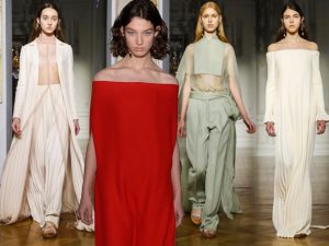Показ открывал образ в классическом стиле: модель вышла на подиум в «греческом» платье из плиссированного крепа цвета слоновой кости. В целом, в весенней кутюрной коллекции было немало лаконичных форм. Креативный директор Valentino сделал ставку на простые, прямые силуэты, окончательно уйдя от привычного пышного кроя с выраженным акцентом на талию. Полупрозрачные ткани, аккуратные оборки, деликатная вышивка в виде стрекоз и цветов — первая сольная «высокая» коллекция Пьерпаоло Пиччоли для Дома стала закономерным продолжением самостоятельной истории, которую дизайнер начал в прошлом году.