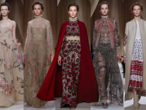 В новой коллекции haute couture дизайнеры Valentino обратились сразу к нескольким источникам вдохновения: это и поэзия, и живопись Марка Шагала, и средневековый традиционный костюм, и даже этника.