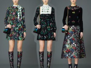 Результатами коллаборации стала линейка casual-платьев, украшенных цветочными орнаментами, последовавший за ней блок с принтами в виде сердец, дополненных фразой …your eyes are the eyes of woman in love… («Твои глаза — это глаза влюбленной женщины»), затем были бабочки и радуги, этника, анималисткие принты, предметы из денима и — финальным аккордом — линейка вечерних платьев с космическим декором, изображающим звезды, Луну, кометы и другие небесные тела. Добавьте к этому бахрому, милитари, инкрустации стразами, объемные аппликации и вышивки, кружево, мех, цветную кожу, замешайте на эстетику 1970-х годов, и вы получите представление о том, сколь разноплановой получилась коллекция, ставшая своеобразным антимилитаристским манифестом, воспевающим мир, любовь и красоту.