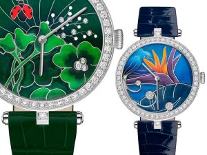 Еще одним открытием Watches & Wonders стали часы, декорированных при помощи необычных художественных техник. На выставке были представлены четыре из девяти моделей, которые Van Cleef & Arpels выпускает в этом году.