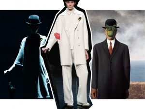 Первые нашли воплощение в силуэтах — подчеркнуто-лаконичных, прямых либо трапециевидных, а также цветовой палитре: в коллекции присутствуют насыщенные синие, алые, брусничные тона, разбавленные молочно-белым, асфальтовым, черным. Сюрреалистические мотивы читаются в проработке деталей: пальто и жакетов, будто снятых с мужского плеча, свободных брючных костюмах, сорочках с отложными воротниками и, конечно, котелках, узнаваемых «героях» многих полотен знаменитого бельгийского художника. Мягкие ткани вроде шотландского мохера, английского твида и итальянского кашемира чередуются с пластичными вискозой, эластаном, жаккардом, плащовкой, а сдержанные силуэты с лихвой компенсируются буйством крупной клетки и аксессуарами: брошами и неизменными зонтами-тростями.