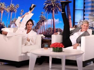 В честь запуска линии косметики Victoria Beckham Beauty в Беверли-Хиллз Виктория Бекхэм стала гостьей шоу Эллен Дедженерес — 45-летний британский дизайнер появилась перед камерами в стильном кипенно-белом брючном костюме от собственного бренда, но сразила гостей не только им…