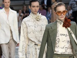 Экспериментируя с настроением будущего сезона, Виктория Бекхэм смешала в бурлящем котле многочисленные референсы и источники вдохновения, почерпнутые в прошлых эпохах, и постаралась переложить их на ДНК своего бренда, сделав упор на контрасты и новое прочтение сексуальности. Для марки Victoria Beckham это действительно что-то новое — само настроение легкости, кокетства и в то же время силы, заставляющее иначе взглянуть на такой, казалось бы, избитый предмет гардероба, как романтическое платье. Благодаря асимметричным оборкам, драпировкам, завязкам и лентам наряды будто бы «оживают», пританцовывают в такт движения модели, а яркие цветовые акценты — зеленый, лиловый и цвет ванильного мороженого — выгодно выделяются на фоне нейтральной палитры. Дизайнер приоткрывает тело — чуть больше, чем когда-либо, — но делает это деликатно, без вычурности и провокационности. Задача — продемонстрировать кожу и соблазнительные изгибы, но сохранить чувство уверенности, которое делают обладательницу наряда сильнее и притягательнее. Впрочем, в линии представлено и другое направление power dressing — например, костюмы в стиле 70-х, брючные комплекты и строгая офисная униформа. Еще один акцент — на принты: флористические, как и положено в весенние цветущие месяцы, и будто бы рукописные, выразительно расчерчивающие белое полотно материи. Все внимание — не только на подиум, но и на первый ряд: поддержать дизайнера пришли актриса Хелен Миррен (как всегда безупречно элегантная в платье со змеиной расцветкой), редактор американского Vogue Анна Винтур и многочисленное семейство Бекхэм: муж Дэвид, сыновья Бруклин, Круз и Ромео, а также дочь Харпер, которой уже исполнилось восемь лет!