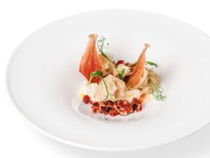 - Тыквенный суп с апельсиновым маслом и утиным крокетом
