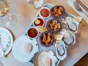 Хрустящие брускетты с подкопченной магаданской креветкой, авокадо и яйцом, салат из командорского кальмара, рукколы и томатов, насыщенная уха из северных пород рыб и морепродуктов, а также запеченный в листьях порея сибас — морская тема раскрыта с особым пристрастием.