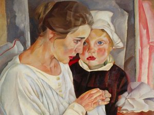Напротив — портрет Юлии Кустодиевой с дочерью Ириной. Выпускница Александровского училища при Смольном институте, она сама увлекалась живописью, в совершенстве знала французский язык, любила музыку. Они познакомились с Борисом Кустодиевым в 1900 году, когда тот еще был молодым, подающим большие надежды студентом Академии художеств. Тогда он написал портрет юной Юленьки — с которого во многом и началась их история любви и изображение которого можно видеть на представленной на выставке картине 1908 года.